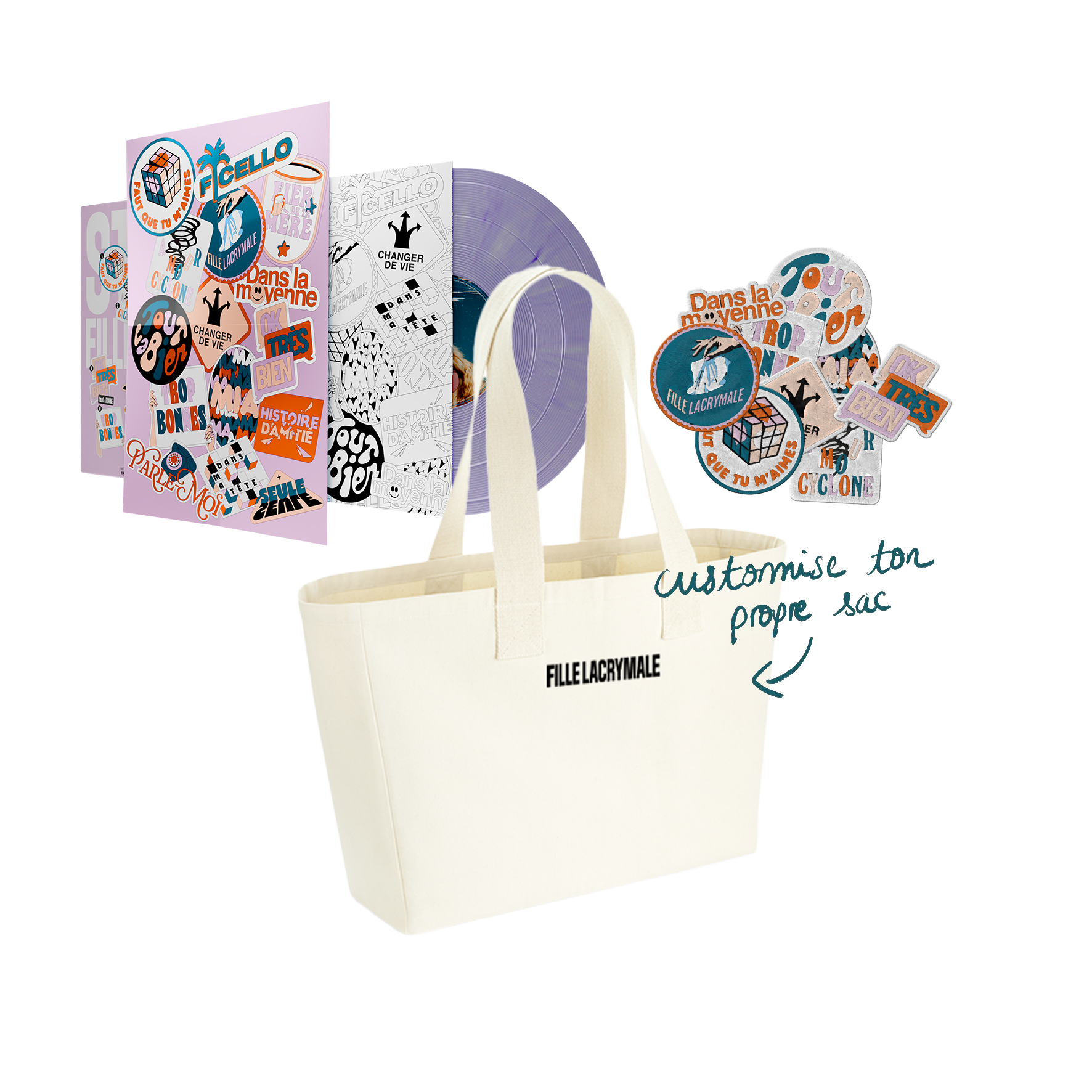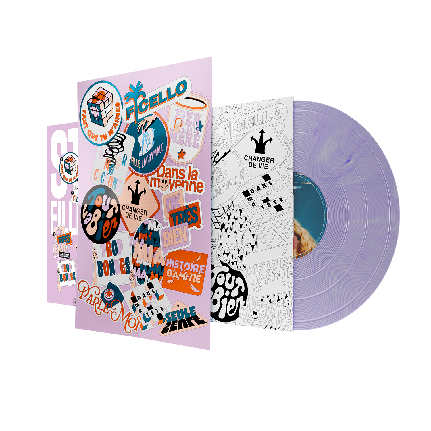 - Un vinyle trop beau couleur lila (on va remettre ça à la mode) avec des posters et des coloriages à l’intérieur (ET AVEC MES CHANSONS BIEN SÛUUUR)